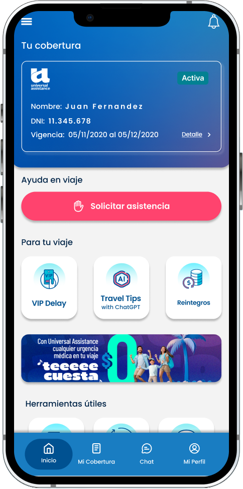 Para garantizar una asistencia oportuna mientras viaja, recomendamos registrarse con Universal Assistance antes de su salida. El registro es más sencillo a través de la aplicación móvil de Universal Assistance, donde podrá ingresar los datos de su póliza (generalmente requerido solo una vez).